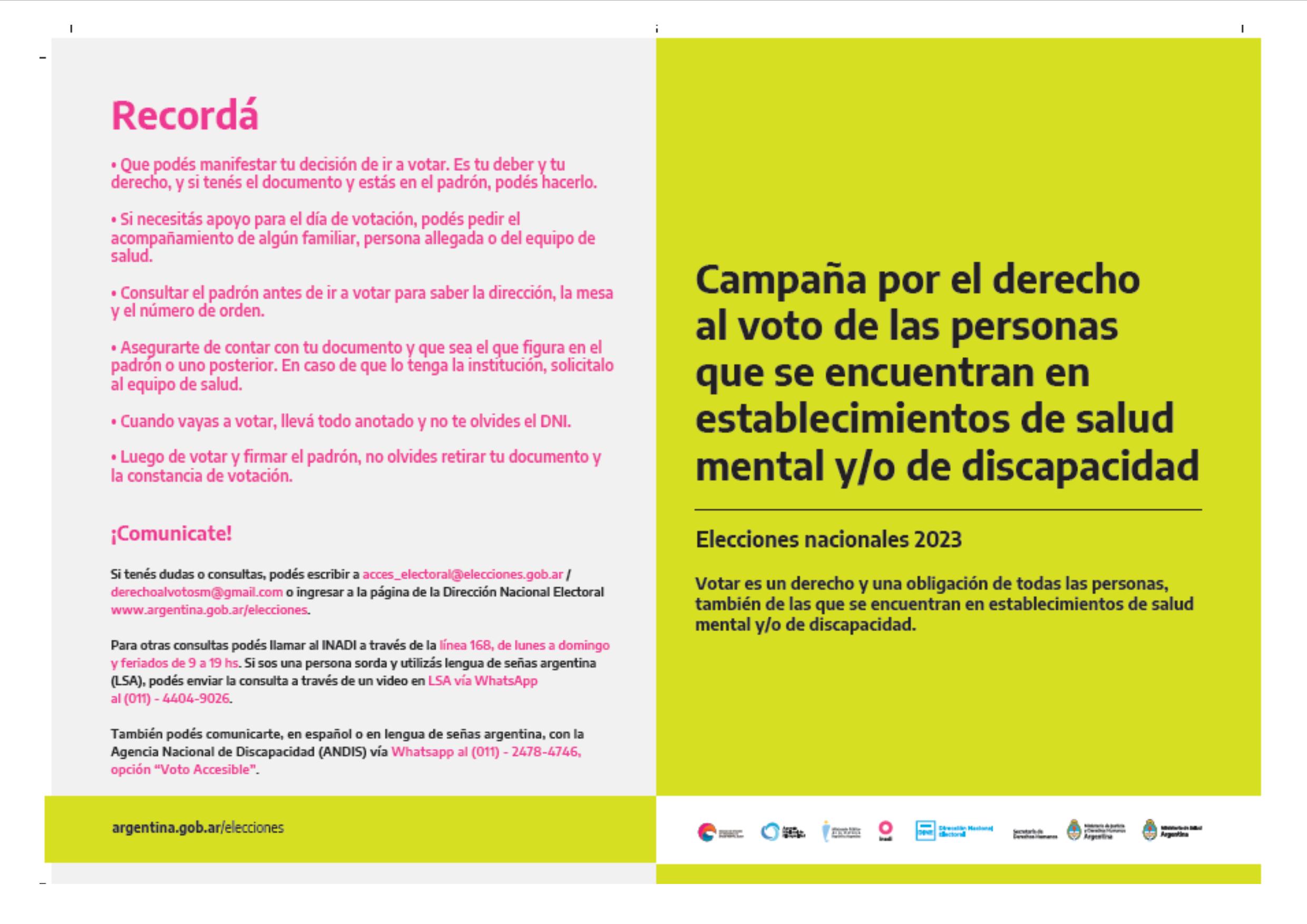 Desde el Estado Nacional se ha conformado la Mesa por el Derecho al Voto, espacio orientado a promover el derecho al voto de las personas internadas en instituciones monovalentes de salud mental públicas y privadas, en hogares para personas con discapacidad y espacios comunitarios en general, tal como lo establece la normativa vigente.