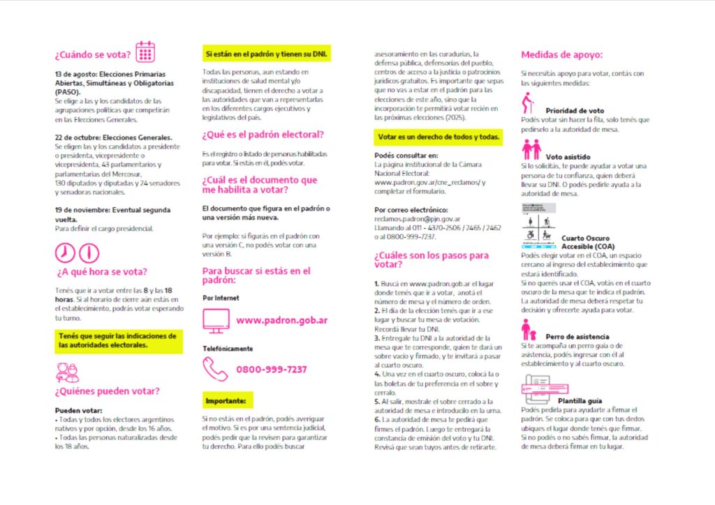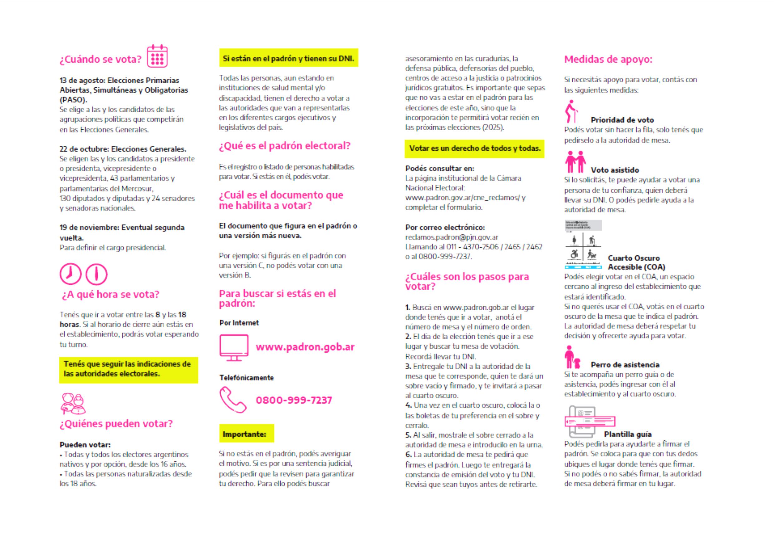 Al ser GEPS integrante del Consejo Consultivo Honorario en Salud Mental y Adicciones (CCHSMyA), recibimos esta información y nos sumamos a la tarea de compartir dos materiales informativos: por un lado, un afiche con información general de la campaña para ser distribuido en instituciones de salud mental y hogares para personas con discapacidad, o bien, socializado en formato digital; por otro lado, un díptico con información general sobre las elecciones para compartirlo con las/os usuaria/os. El mismo se podrá socializar de forma digital o solicitar de forma impresa.