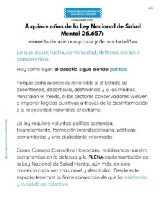 Pronunciamiento a 15 años de la sanción de la LNSM 26657